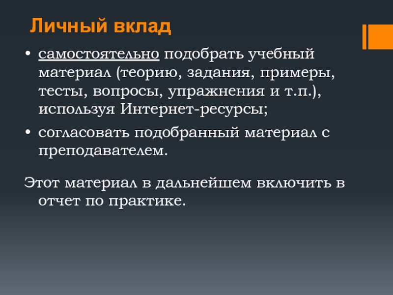 самостоятельно подобрать учебный материал (теорию, задания, примеры, тесты, вопросы, упражнения