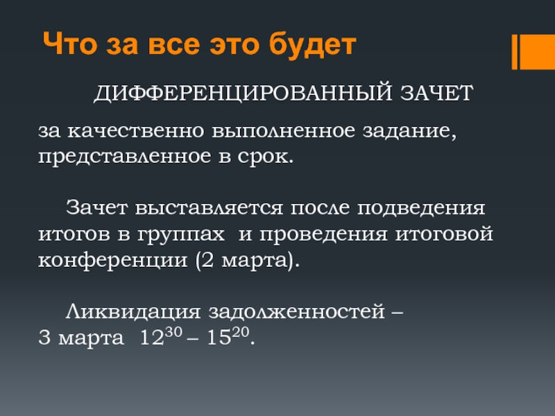 Зачет выставляется после подведения итогов в группах и проведения итоговой конференции (2 марта).