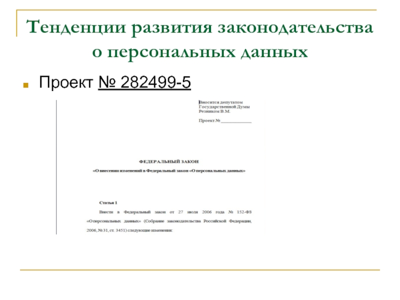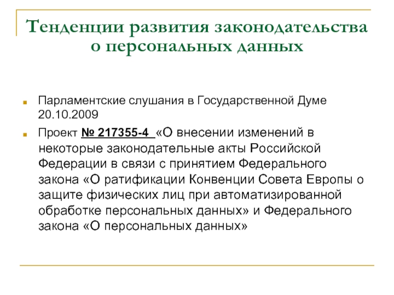Проект № 217355-4 «О внесении изменений в некоторые законодательные акты Российской Федерации в связи с принятием Федерального закона «О ратификации Конвенции Совета Европы о защите физических лиц при автоматизированной обработке персональных данных» и Федерального закона «О персональных данных»