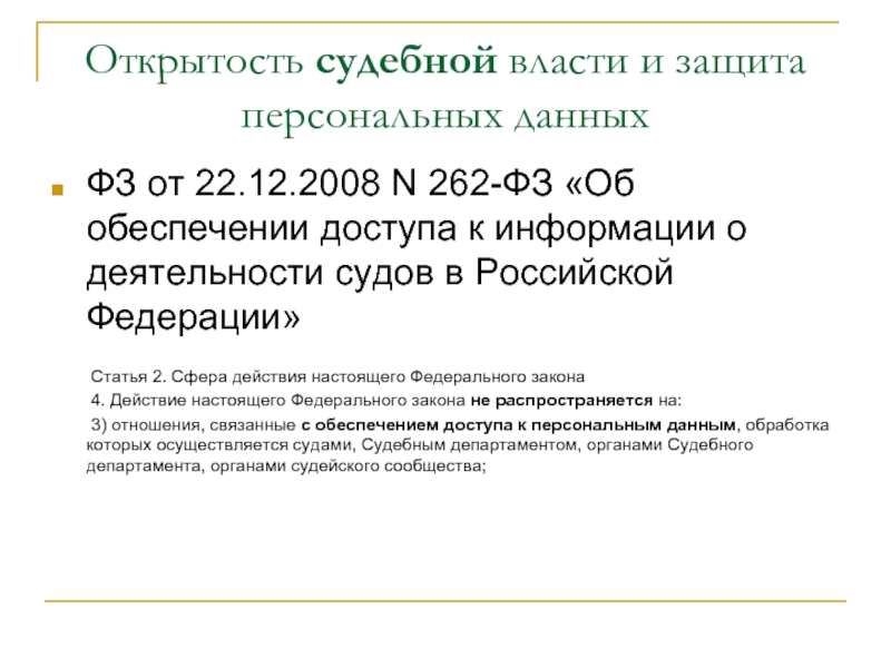 3) отношения, связанные с обеспечением доступа к персональным данным, обработка которых осуществляется судами, Судебным департаментом, органами Судебного департамента, органами судейского сообщества;