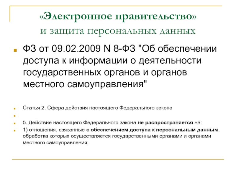 1) отношения, связанные с обеспечением доступа к персональным данным, обработка которых осуществляется государственными органами и органами местного самоуправления;