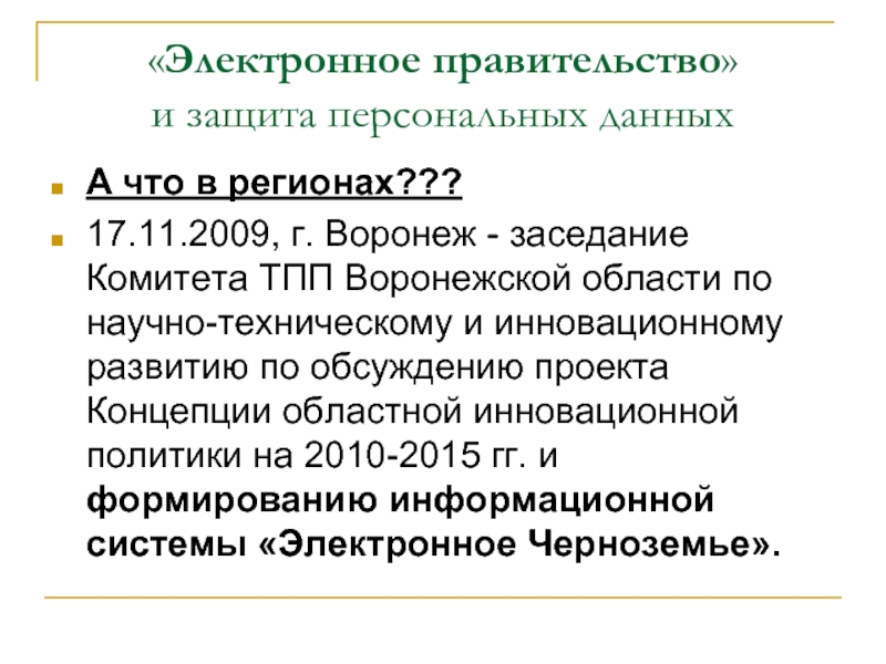 - заседание Комитета ТПП Воронежской области по научно-техническому и инновационному развитию по обсуждению проекта Концепции областной инновационной политики на 2010-2015 гг. и формированию информационной системы «Электронное Черноземье».