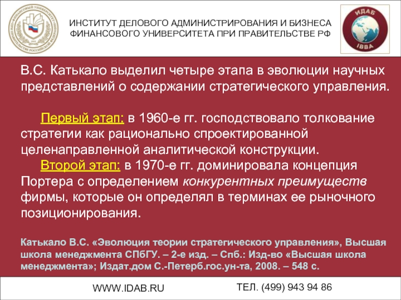 Катькало В.С. «Эволюция теории стратегического управления», Высшая школа менеджмента СПбГУ. – 2-е изд. – Спб.: Изд-во «Высшая школа менеджмента»; Издат.дом С.-Петерб.гос.ун-та, 2008. – 548 с.