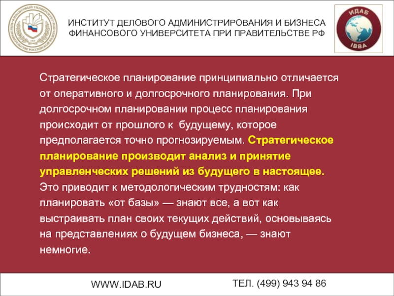 Стратегическое планирование принципиально отличается от оперативного и долгосрочного планирования. При долгосрочном планировании процесс планирования происходит от прошлого к будущему, которое предполагается точно прогнозируемым. Стратегическое планирование производит анализ и принятие управленческих решений из будущего в настоящее. Это приводит к методологическим трудностям: как планировать «от базы» — знают все, а вот как выстраивать план своих текущих действий, основываясь на представлениях о будущем бизнеса, — знают немногие.