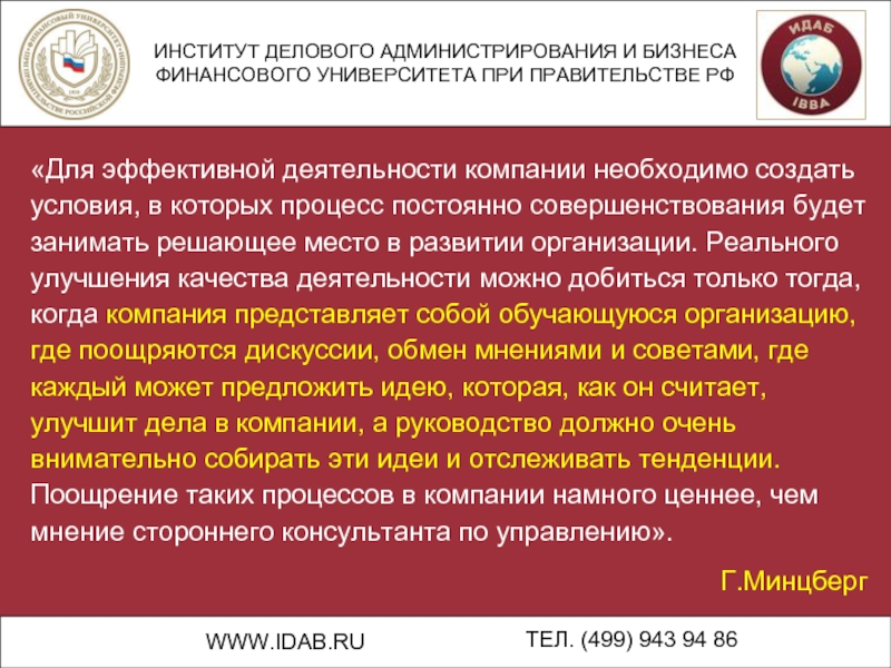 «Для эффективной деятельности компании необходимо создать условия, в которых процесс постоянно совершенствования будет занимать решающее место в развитии организации. Реального улучшения качества деятельности можно добиться только тогда, когда компания представляет собой обучающуюся организацию, где поощряются дискуссии, обмен мнениями и советами, где каждый может предложить идею, которая, как он считает, улучшит дела в компании, а руководство должно очень внимательно собирать эти идеи и отслеживать тенденции. Поощрение таких процессов в компании намного ценнее, чем мнение стороннего консультанта по управлению».