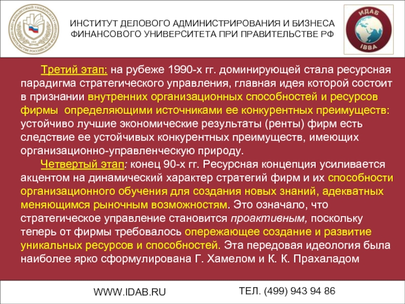 Третий этап: на рубеже 1990-х гг. доминирующей стала ресурсная парадигма стратегического управления, главная идея которой состоит в признании внутренних организационных способностей и ресурсов фирмы определяющими источниками ее конкурентных преимуществ: устойчиво лучшие экономические результаты (ренты) фирм есть следствие ее устойчивых конкурентных преимуществ, имеющих организационно-управленческую природу.