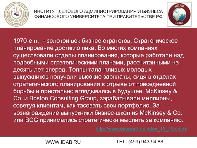 1970-е гг. - золотой век бизнес-стратегов. Стратегическое планирование достигло пика. Во многих компаниях существовали отделы планирования, которые работали над подробными стратегическими планами, рассчитанными на десять лет вперед. Толпы талантливых молодых выпускников получали высокие зарплаты, сидя в отделах стратегического планирования в отрыве от повседневной борьбы и пристально вглядываясь в будущее. McKinsey & Со. и Boston Consulting Group, зарабатывали миллионы, советуя клиентам, как тасовать свои портфолио. За вознаграждение выпускники бизнес-школ из McKinsey & Со. или BCG принимались стратегически мыслить за компанию.