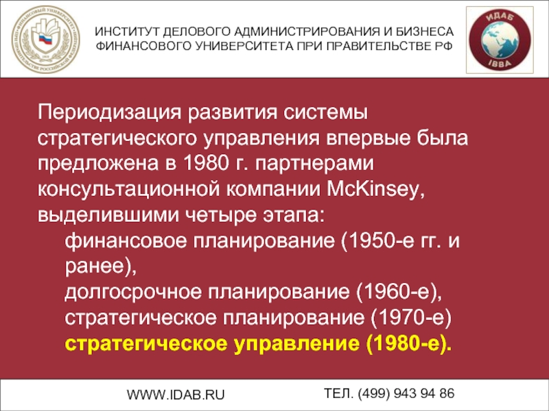 Периодизация развития системы стратегического управления впервые была предложена в 1980 г. партнерами консультационной компании McKinsey, выделившими четыре этапа: