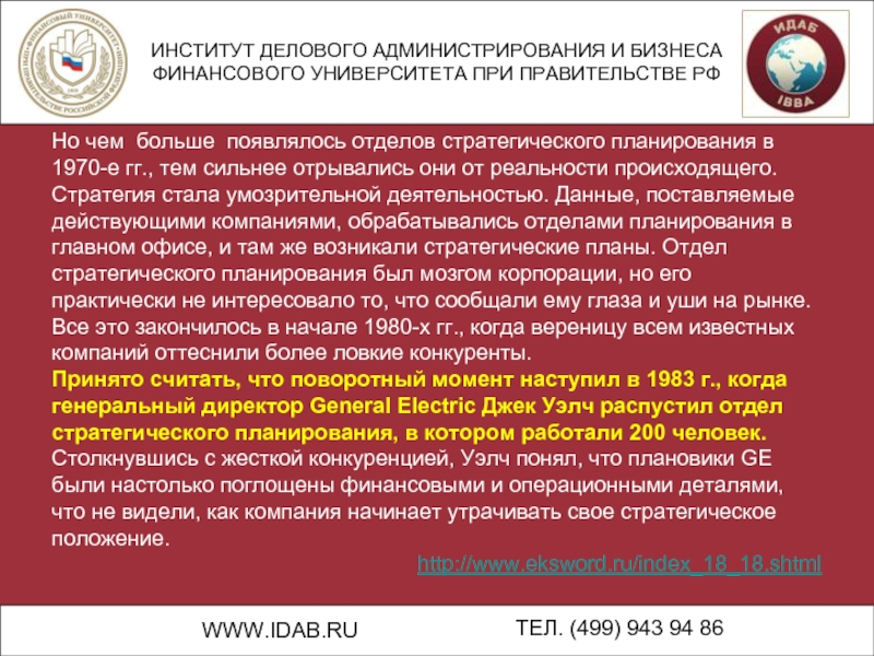 Принято считать, что поворотный момент наступил в 1983 г., когда генеральный директор General Electric Джек Уэлч распустил отдел стратегического планирования, в котором работали 200 человек.