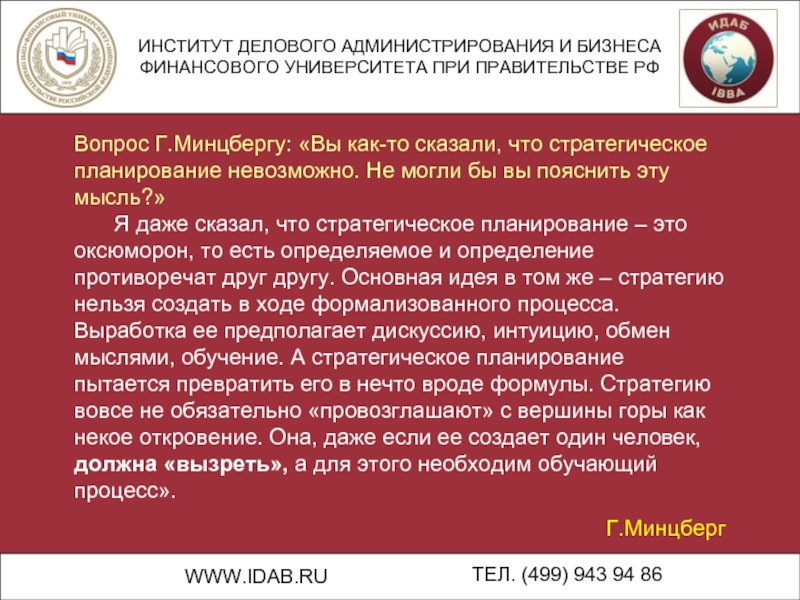 Вопрос Г.Минцбергу: «Вы как-то сказали, что стратегическое планирование невозможно. Не могли бы вы пояснить эту мысль?»