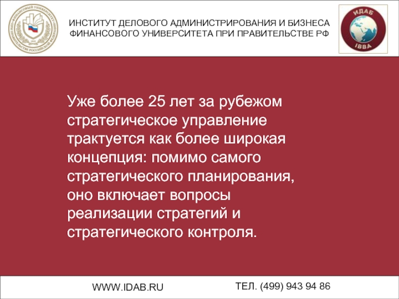 Уже более 25 лет за рубежом стратегическое управление трактуется как более широкая концепция: помимо самого стратегического планирования, оно включает вопросы реализации стратегий и стратегического контроля.