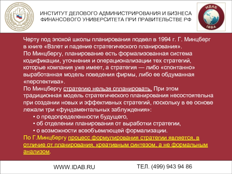 Черту под эпохой школы планирования подвел в 1994 г. Г. Минцберг в книге «Взлет и падение стратегического планирования».