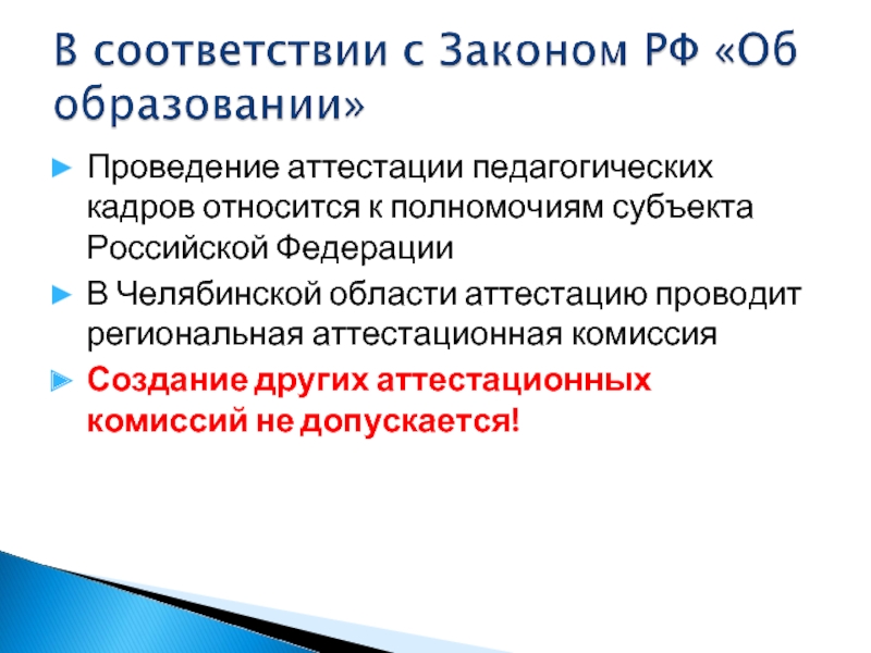 Слайд 12Проведение аттестации педагогических кадров относится к полномочиям субъекта Российской Федерации