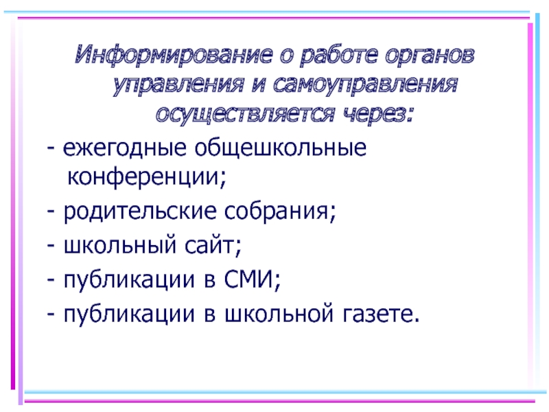 Слайд 26Информирование о работе органов управления и самоуправления осуществляется через: