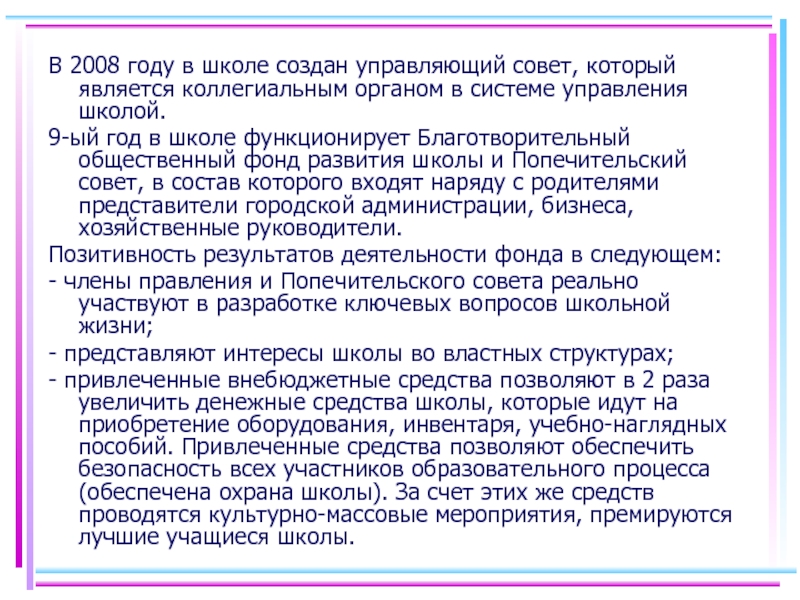 Слайд 24В 2008 году в школе создан управляющий совет, который является коллегиальным
