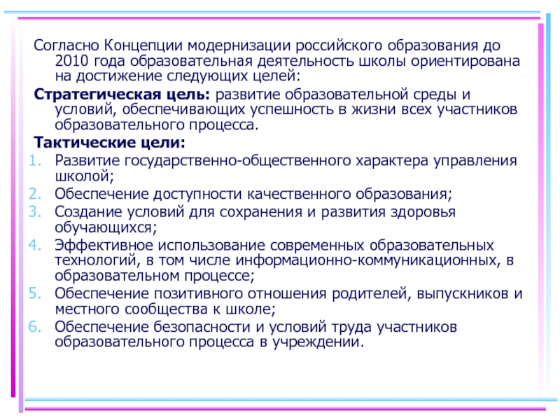 Слайд 3Согласно Концепции модернизации российского образования до 2010 года образовательная деятельность школы
