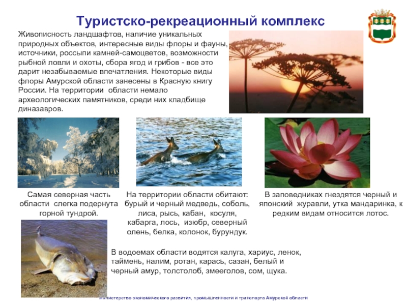 Живописность ландшафтов, наличие уникальных природных объектов, интересные виды флоры и фауны, источники, россыпи камней-самоцветов, возможности рыбной ловли и охоты, сбора ягод и грибов - все это дарит незабываемые впечатления. Некоторые виды флоры Амурской области занесены в Красную книгу России. На территории области немало археологических памятников, среди них кладбище диназавров.