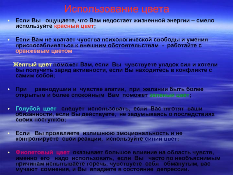 Голубой цвет следует использовать, если Вас тяготят ваши обязанности, если Вы действуете, не задумываясь о последствиях своих поступков;