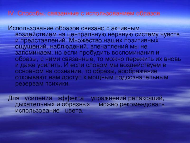 на центральную нервную систему чувств и представлений. Множество наших позитивных ощущений, наблюдений, впечатлений мы не запоминаем, но если пробудить воспоминания и образы, с ними связанные, то можно пережить их вновь и даже усилить. И если словом мы воздействуем в основном на сознание, то образы, воображение открывают нам доступ к мощным подсознательным резервам психики.