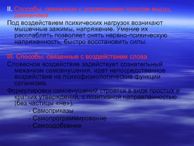 Слайд 10II. Способы, связанные с управлением тонусом мышц, движением
