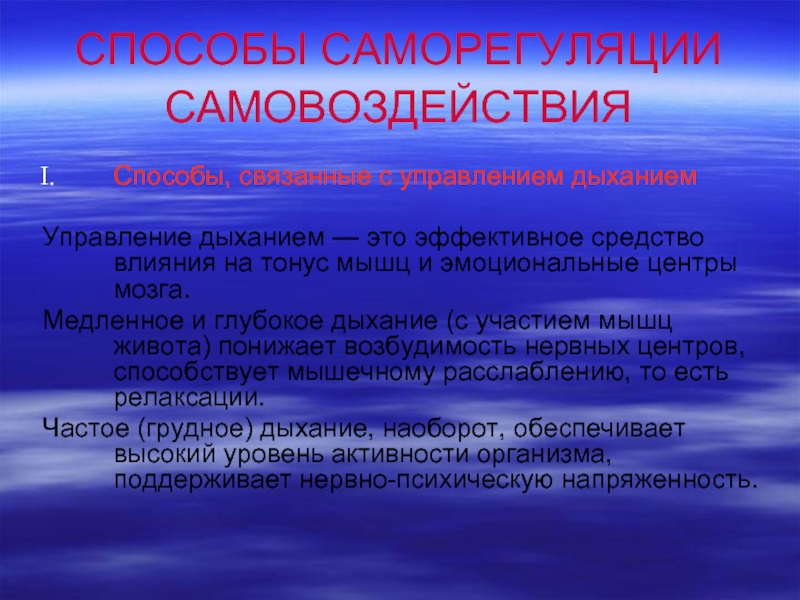 Медленное и глубокое дыхание (с участием мышц живота) понижает возбудимость нервных центров, способствует мышечному расслаблению, то есть релаксации.