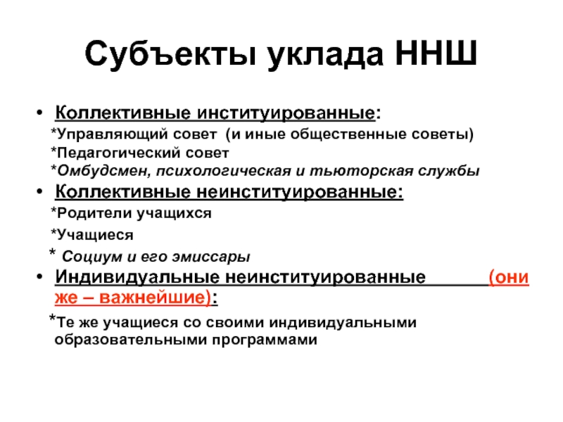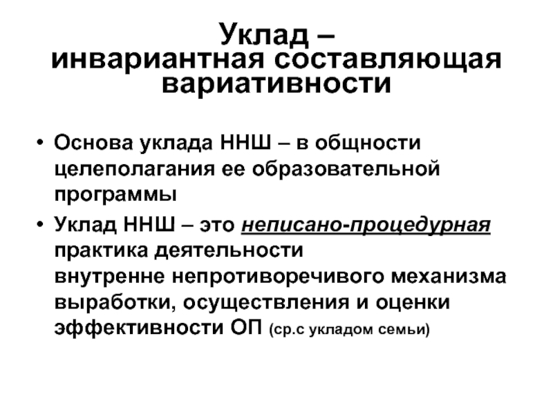 Уклад ННШ – это неписано-процедурная практика деятельности внутренне непротиворечивого механизма выработки, осуществления и оценки эффективности ОП (ср.с укладом семьи)