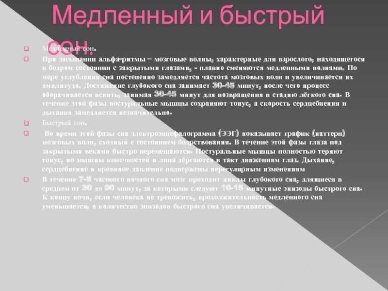 характерные для взрослого, находящегося в бодром состоянии с закрытыми глазами, - плавно сменяются медленными волнами. По мере углубления сна постепенно замедляется частота мозговых волн и увеличивается их амплитуда. Достижение глубокого сна занимает 30-45 минут, после чего процесс оборачивается вспять, занимая 30-45 минут для возвращения в стадию лёгкого сна. В течение этой фазы постуральные мышцы сохраняют тонус, а скорость сердцебиения и дыхания замедляется незначительно.
