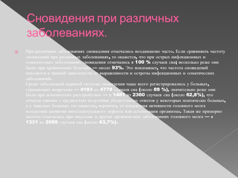 Среди заболеваний нервной системы сновидения чаще всего регистрировались у больных, страдающих неврозами — 4193 из 4778 случаев сна (около 88 %), значительно реже они были при психических расстройствах — в 1481 из 2360 случаев сна (около 62,8%), что отчасти связано с трудностью получения убедительных ответов у некоторых психически больных, а у тяжелых больных это зависело, вероятно, от понижения активности головного мозга вследствие развития интеллектуального дефекта или астенизации организма. Такая же примерно частота отмечалась при опухолях и других органических заболеваниях головного мозга — в 1331 из 2089 случаев сна (около 63,7%).