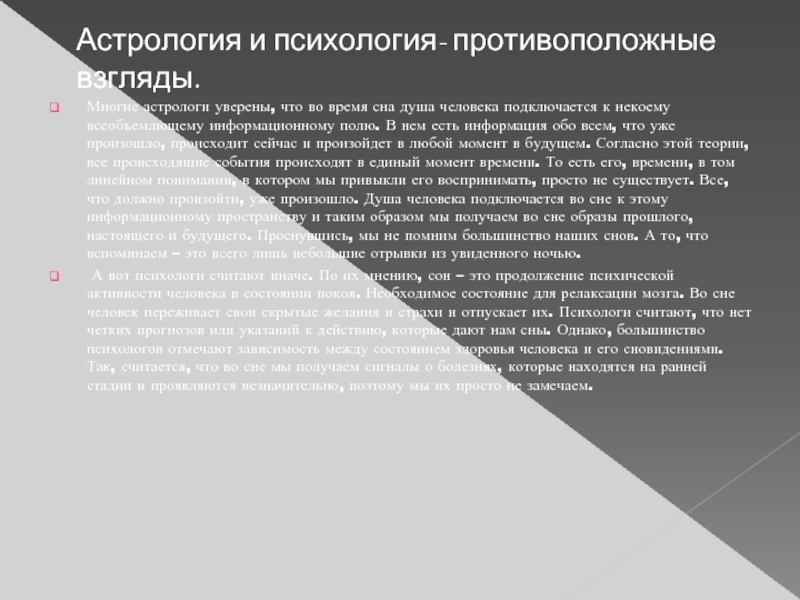 А вот психологи считают иначе. По их мнению, сон – это продолжение психической активности человека в состоянии покоя. Необходимое состояние для релаксации мозга. Во сне человек переживает свои скрытые желания и страхи и отпускает их. Психологи считают, что нет четких прогнозов или указаний к действию, которые дают нам сны. Однако, большинство психологов отмечают зависимость между состоянием здоровья человека и его сновидениями. Так, считается, что во сне мы получаем сигналы о болезнях, которые находятся на ранней стадии и проявляются незначительно, поэтому мы их просто не замечаем.