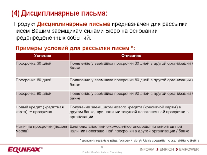 * дополнительные виды условий могут быть созданы по желанию клиента