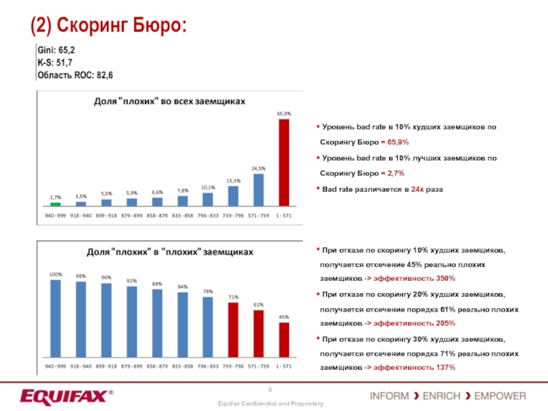 Уровень bad rate в 10% худших заемщиков по Скорингу Бюро = 65,9%