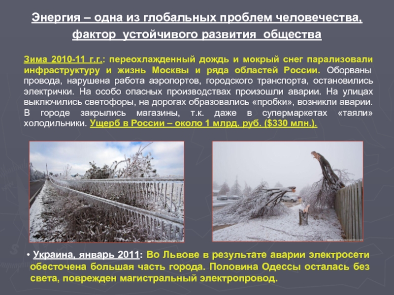 Слайд 5Зима 2010-11 г.г.: переохлажденный дождь и мокрый снег парализовали инфраструктуру и