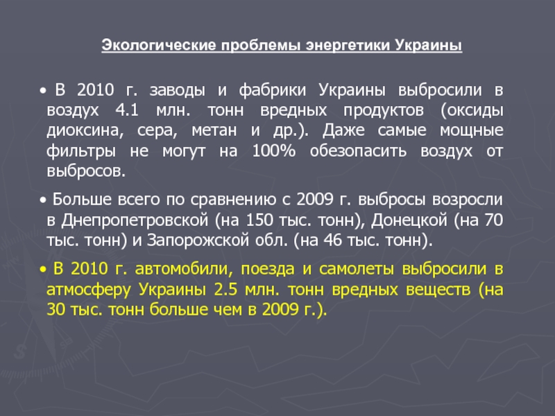 В 2010 г. автомобили, поезда и самолеты выбросили в атмосферу Украины 2.5 млн. тонн вредных веществ (на 30 тыс. тонн больше чем в 2009 г.).