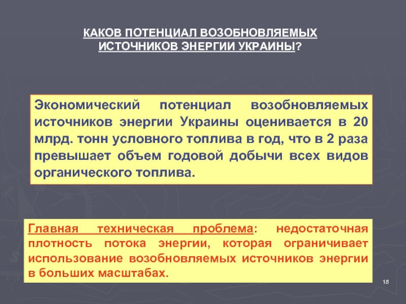 Слайд 18Экономический потенциал возобновляемых источников энергии Украины оценивается в 20 млрд. тонн