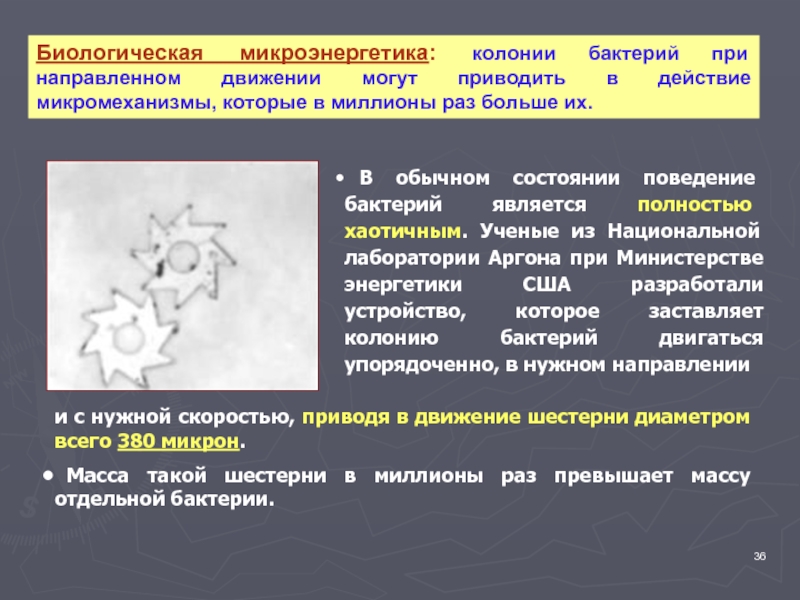 Слайд 36 В обычном состоянии поведение бактерий является полностью хаотичным. Ученые из