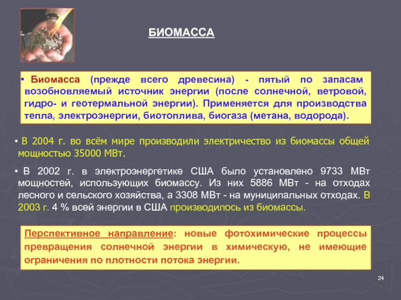 Биомасса (прежде всего древесина) - пятый по запасам возобновляемый источник энергии (после солнечной, ветровой, гидро- и геотермальной энергии). Применяется для производства тепла, электроэнергии, биотоплива, биогаза (метана, водорода).