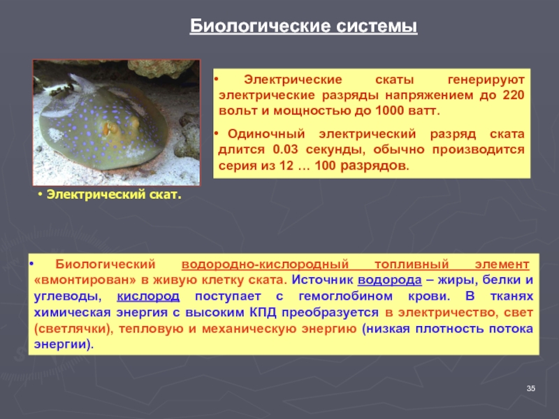 Источник водорода – жиры, белки и углеводы, кислород поступает с гемоглобином крови. В тканях химическая энергия с высоким КПД преобразуется в электричество, свет (светлячки), тепловую и механическую энергию (низкая плотность потока энергии).