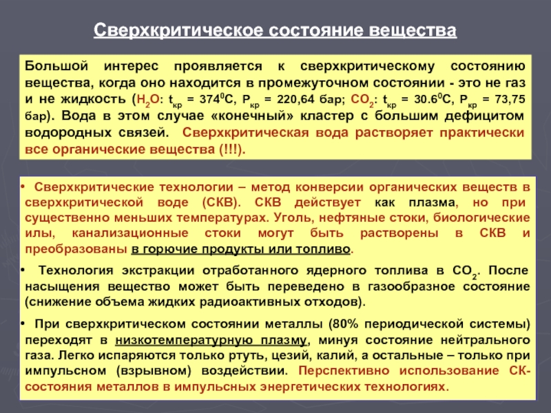 Большой интерес проявляется к сверхкритическому состоянию вещества, когда оно