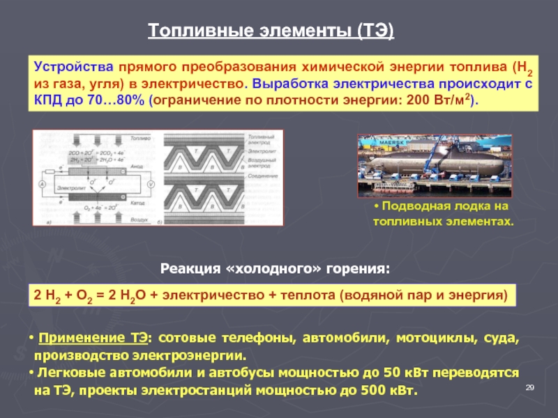 Слайд 29Устройства прямого преобразования химической энергии топлива (Н2 из газа, угля) в