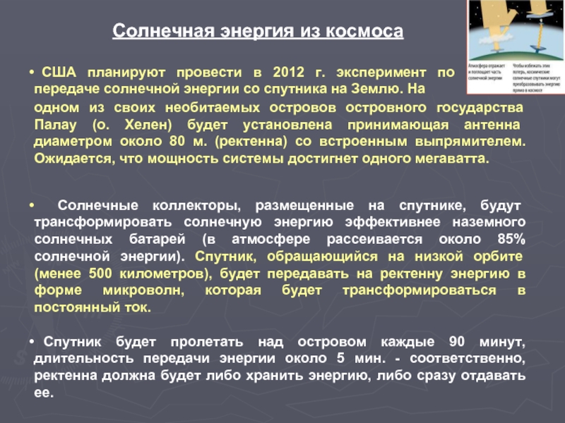 наземного солнечных батарей (в атмосфере рассеивается около 85% солнечной энергии). Спутник, обращающийся на низкой орбите (менее 500 километров), будет передавать на ректенну энергию в форме микроволн, которая будет трансформироваться в постоянный ток.