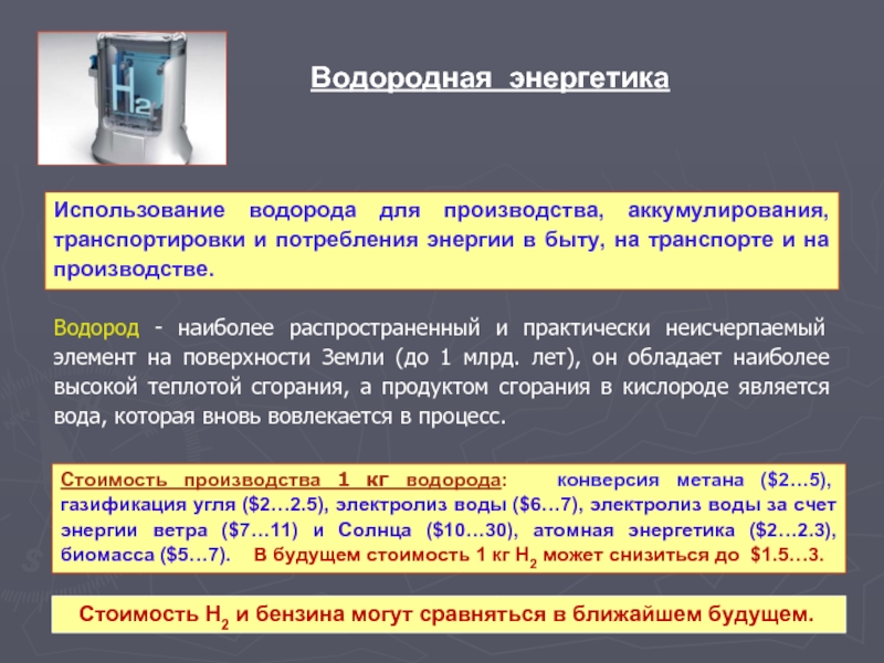 Стоимость производства 1 кг водорода: конверсия метана ($2…5), газификация угля ($2…2.5), электролиз воды ($6…7), электролиз воды за счет энергии ветра ($7…11) и Cолнца ($10…30), атомная энергетика ($2…2.3), биомасса ($5…7). В будущем стоимость 1 кг Н2 может снизиться до $1.5…3.
