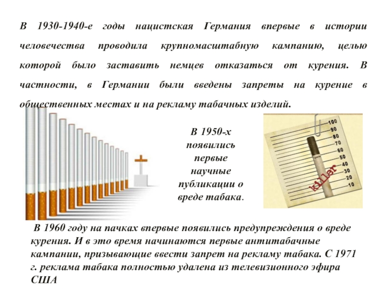 В 1930-1940-е годы нацистская Германия впервые в истории человечества проводила крупномасштабную кампанию, целью которой было заставить немцев отказаться от курения. В частности, в Германии были введены запреты на курение в общественных местах и на рекламу табачных изделий.