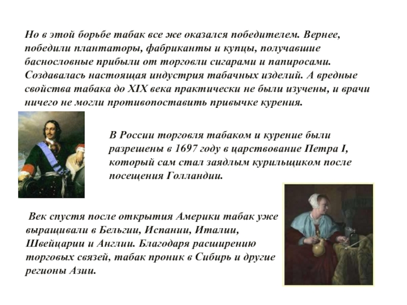 Но в этой борьбе табак все же оказался победителем. Вернее, победили плантаторы, фабриканты и купцы, получавшие баснословные прибыли от торговли сигарами и папиросами. Создавалась настоящая индустрия табачных изделий. А вредные свойства табака до XIX века практически не были изучены, и врачи ничего не могли противопоставить привычке курения.