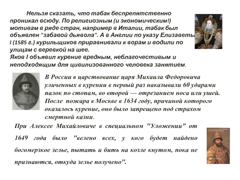При Алексее Михайловиче в специальном "Уложении" от 1649 года было "велено всех, у кого будет найдено богомерзкое зелье, пытать и бить на козле кнутом, пока не признаются, откуда зелье получено".