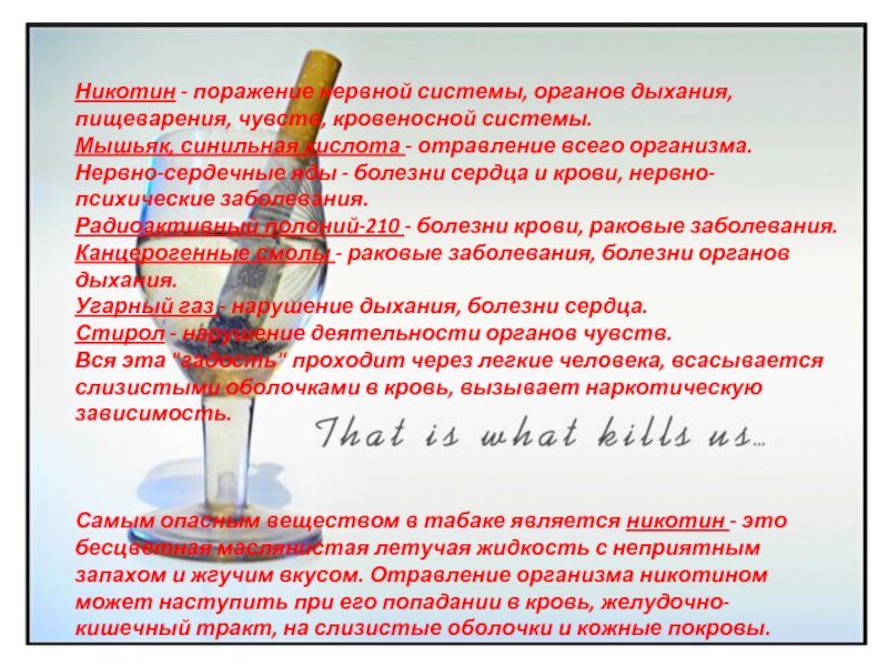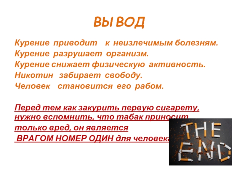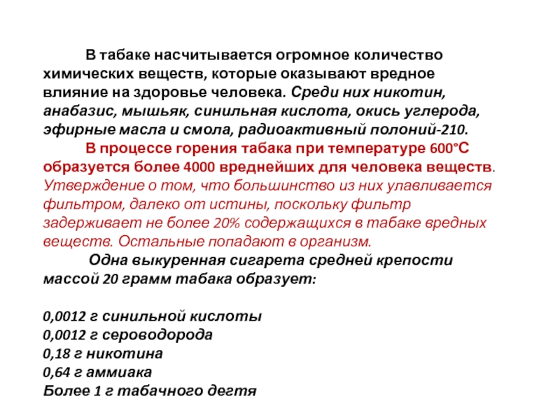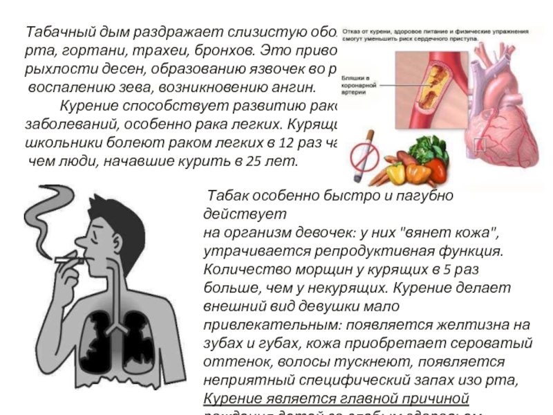 на организм девочек: у них "вянет кожа", утрачивается репродуктивная функция. Количество морщин у курящих в 5 раз больше, чем у некурящих. Курение делает внешний вид девушки мало привлекательным: появляется желтизна на зубах и губах, кожа приобретает сероватый оттенок, волосы тускнеют, появляется неприятный специфический запах изо рта, Курение является главной причиной рождения детей со слабым здоровьем, физическими и умственными недостатками.