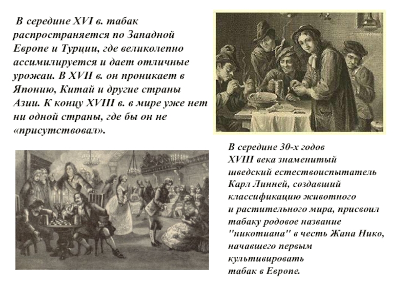Век спустя после открытия Америки табак уже выращивали в Бельгии, Испании, Италии, Швейцарии и Англии. Благодаря расширению торговых связей, табак проник в Сибирь и другие регионы Азии.