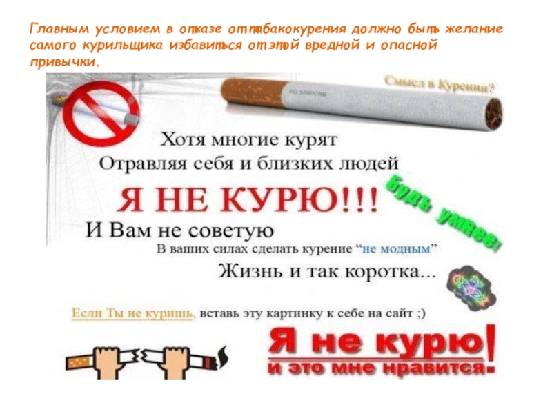 Главным условием в отказе от табакокурения должно быть желание самого курильщика избавиться от этой вредной и опасной привычки.