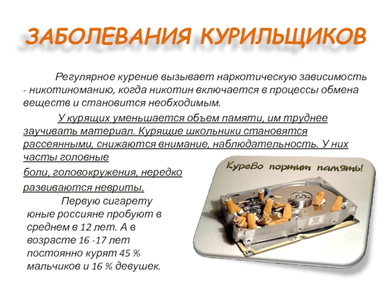 Первую сигарету юные россияне пробуют в среднем в 12 лет. А в возрасте 16 -17 лет постоянно курят 45 % мальчиков и 16 % девушек.