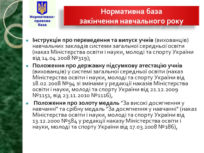 Слайд 18Інструкція про переведення та випуск учнів (вихованців) навчальних закладів системи загальної