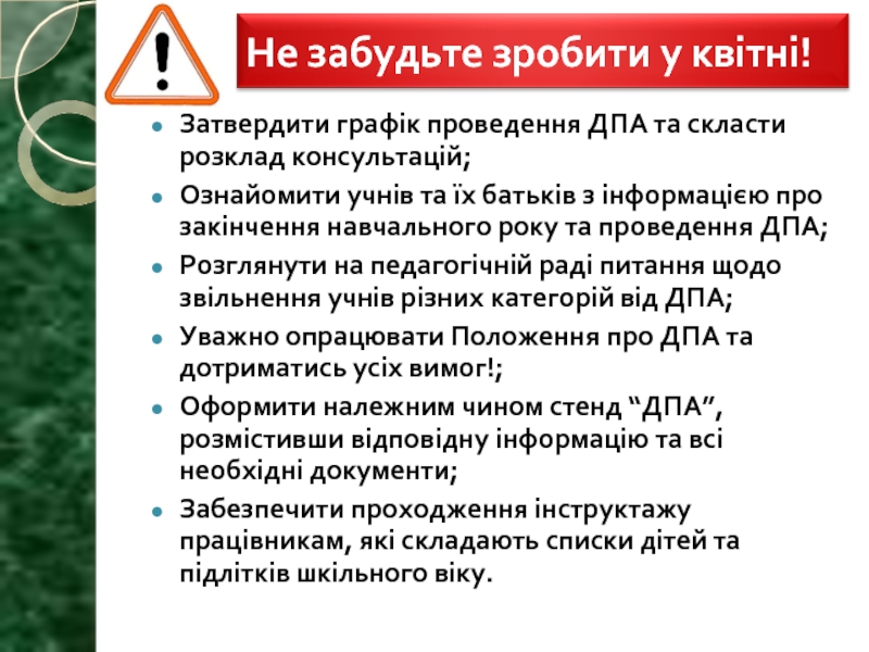 Слайд 29Затвердити графік проведення ДПА та скласти розклад консультацій;